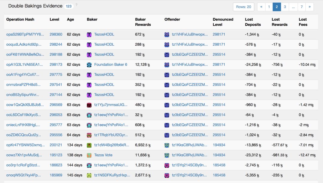 在Tezos社区,有一个tzscan的浏览器,专门记录着被Slash过的矿工。这个记录中显示了具体被Slash的抵押金以及丢失的奖励,从以下表中可以看到,有高达24256个XTZ被系统扣除(Slash)的记录,加上丢失的756个奖励,计算下来,这个验证人在一个1分钟的块里,总共丢失了17万人民币。而像TezosHODL这样的矿工,更有连续触发系统Slash的情况出现,丢失奖励不说,更痛苦的是自己的抵押金被扣除了。