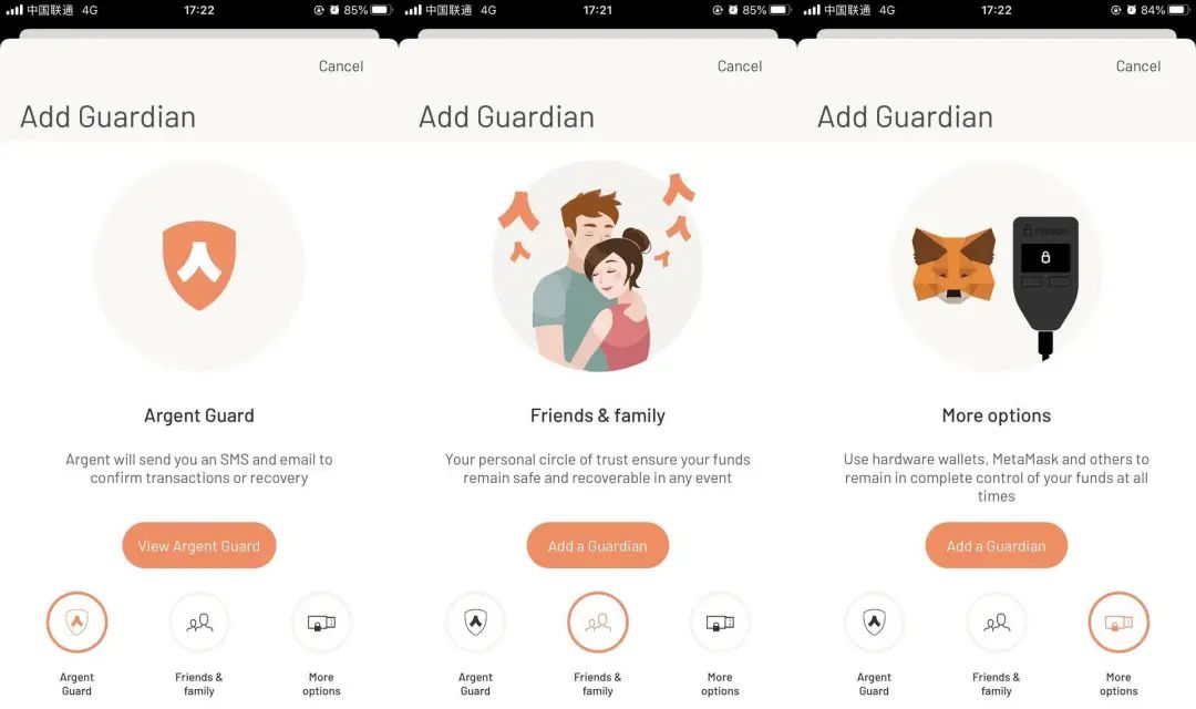 为了解决这一问题, Argent 设计了一个监护人(Guardians)的角色,主要用来帮用户恢复自己的账户。用户还可以将监护人设置为 Argent 官方、亲友或者其他的硬件钱包,以帮助其在极端情况下通过监护人找回账户。