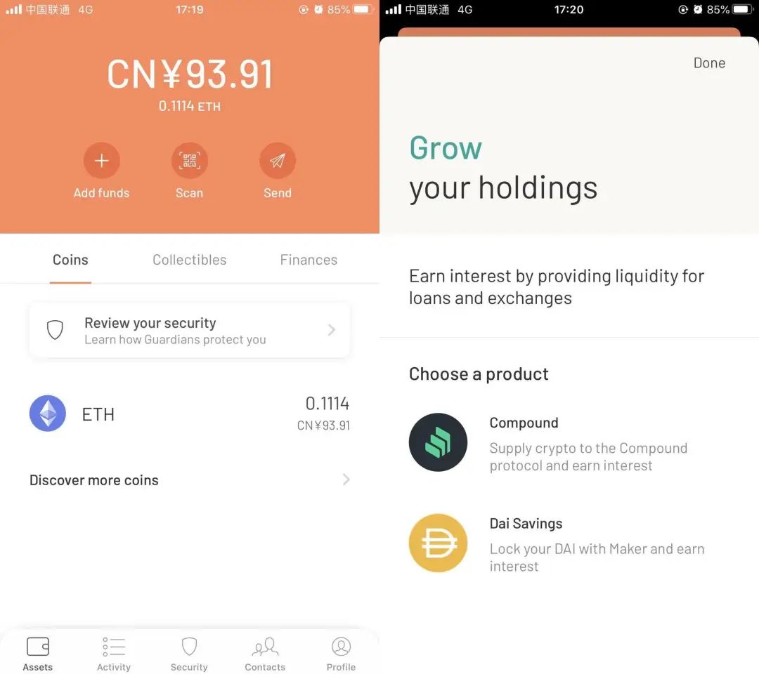 储蓄交易功能其实就是接入了 DeFi 的产品,用户可以在这一板块质押 Tezos、通过 Compound 存 Dai 生息等。