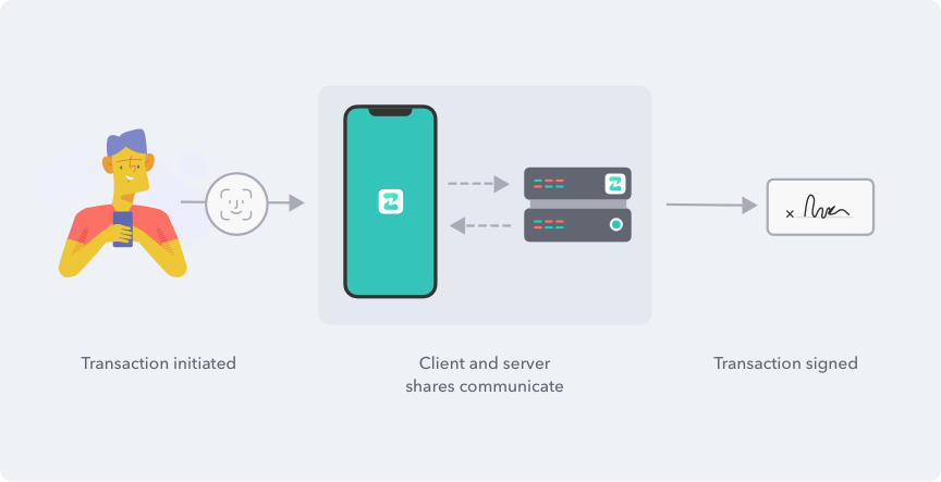ZenGo 使用的是门限签名方案,私钥被切割成了两份。一部分私钥在用户的手机端进行加密存储,用户使用时可以通过 TouchID/FaceID 授权访问。而另一部分的私钥被存储在 ZenGo 服务器上。