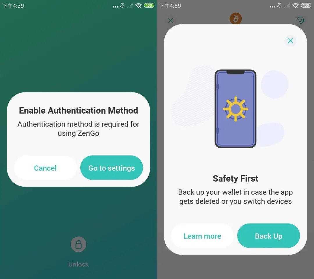 在交易前,ZenGo 还要求用户备份自己的钱包,以免 App 数据丢失。