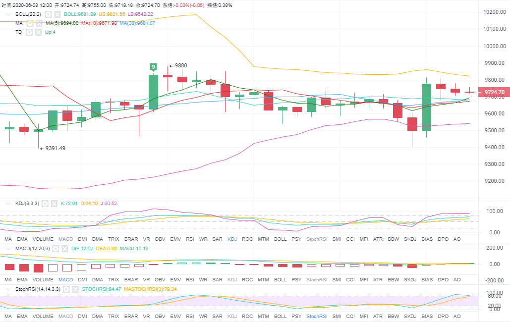 回顾一下这两天的行情,周六行情波动不大也就是在200点区间内来回震荡,周末比特币价格自中午开始有了明显下跌趋势,截止到晚间十点左右共持续下跌300左右达到近日来最低点位9400,随后空头减弱多头开始放量,在凌晨时间多头放量最大化短时内反弹300点,价格来来回回又重新回到前几日高点9800震荡区间。