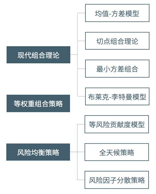 随着数字资产量化基金行业的发展,如何构建基金组合的讨论日益增多,市场对FOF管理人的专业要求也日趋严格。传统金融市场中的资产配置策略大致可划分为现代组合理论、风险均衡/平价策略以及等权重组合策略。现代组合理论和风险均衡理论下又有细分。下图展示了不同理论下的代表性模型: