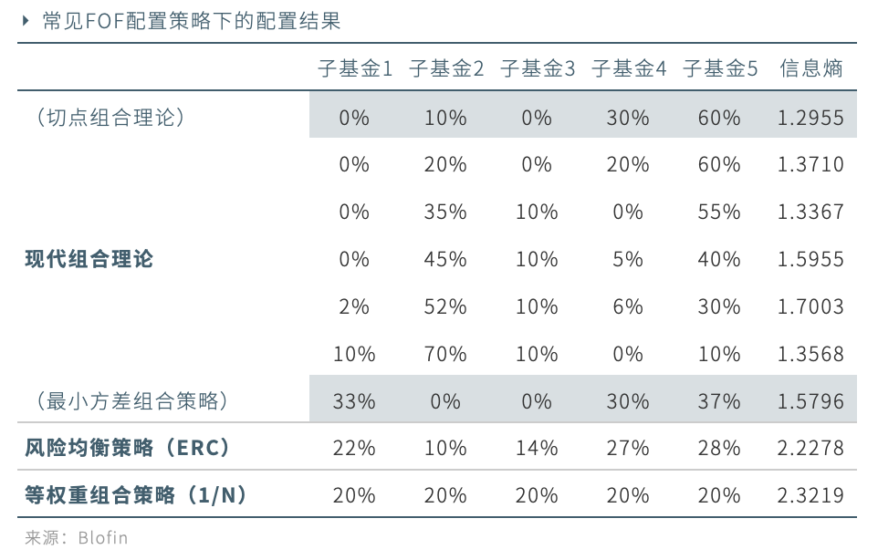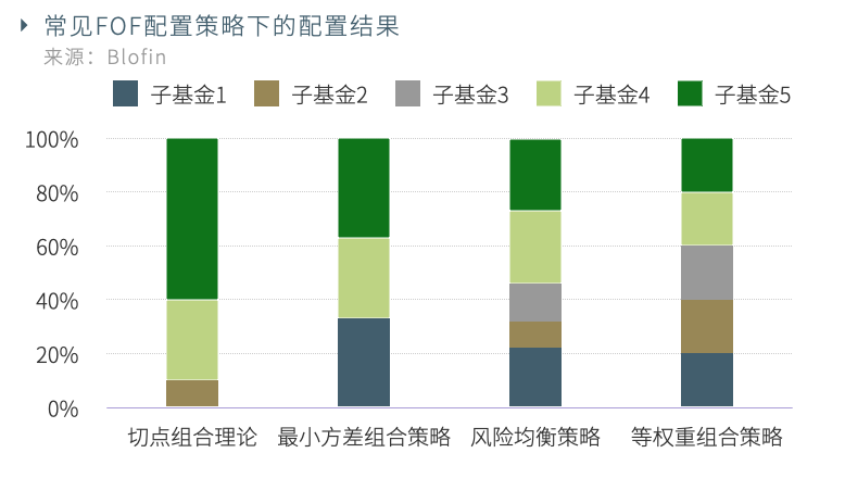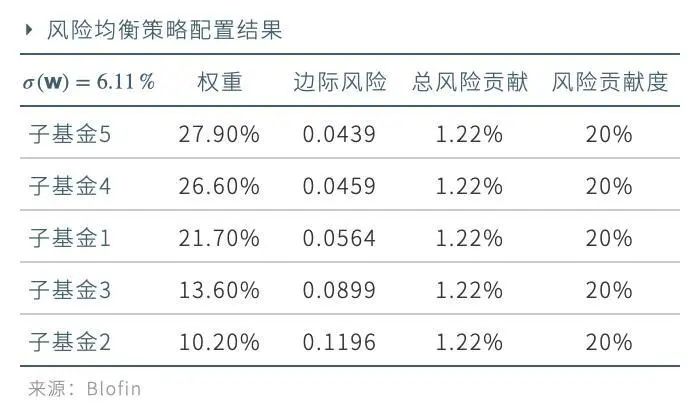 以五支子基金构成的投资域为例,风险均衡策略下的配置方案如下: