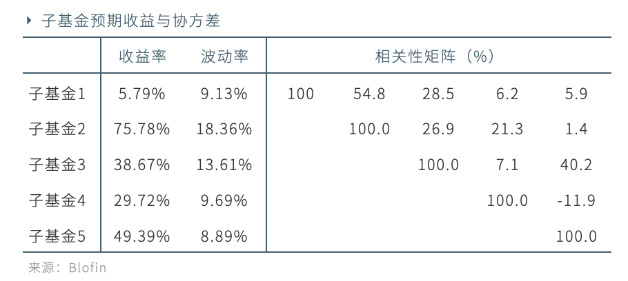本节将以五支典型的数字资产量化基金组成的拟投资产域为例,比较前文所述的不同策略的配置结果。为公平进行比较,我们统一用五支子基金2019.11.1至2020.2.29的净值数据作为训练集计算配置方案。根据训练期各基金的净值标新预测得到收益与协方差矩阵(可由表中波动率及相关性矩阵得到)如下表所示:
