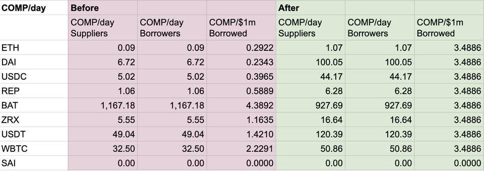 第二个问题的解决方案是,将原先基于应计利息进行 COMP 代币分配的标准改为基于从协议中产生的借款,也就是说,未来 Compound 协议将根据各个市场中产生的借款总金额来分配 COMP。根据新规定,用户每从 Compound 中进行一次加密资产借款(而不是根据产生的利息),COMP 将进行一次分配,对于借方和贷方按照 50/50 的比例分配。