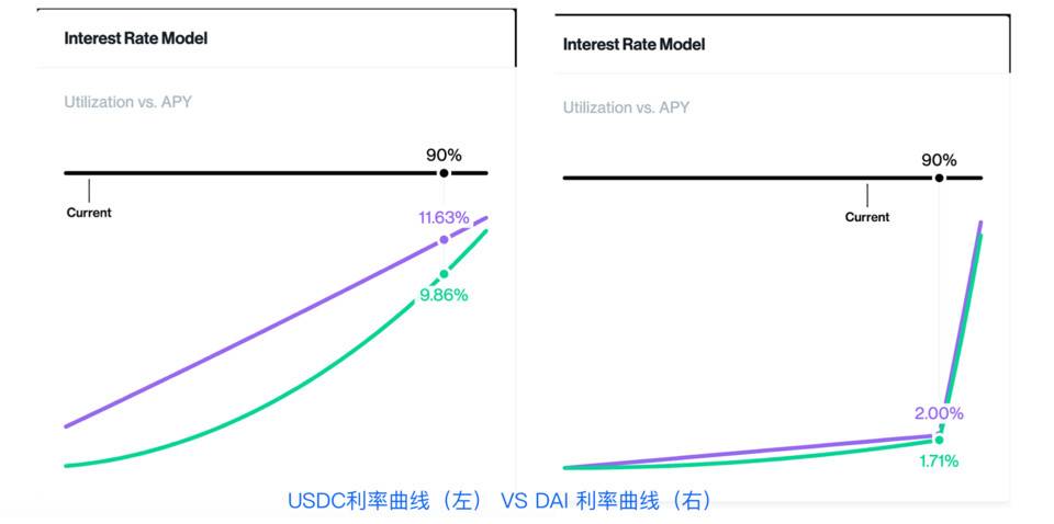 根据这两种代币的利率曲线可看出,虽然 USDC 的流动性挖矿更容易且更安全(价格稳定为 1 美金,供应量和潜在供应量都更大,流动性更高),但利率更低的 Dai 可最大化资金利用率可以达到 98%,这意味着,与 USDC 相比,利用同等价值的 Dai 在 Compound 进行挖矿可获得更多收益。