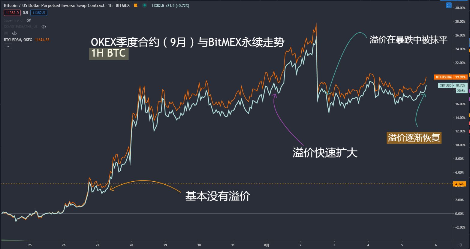 19年中旬狂暴大牛市中OK季度和BM永续的价差曾经到了夸张的800美元