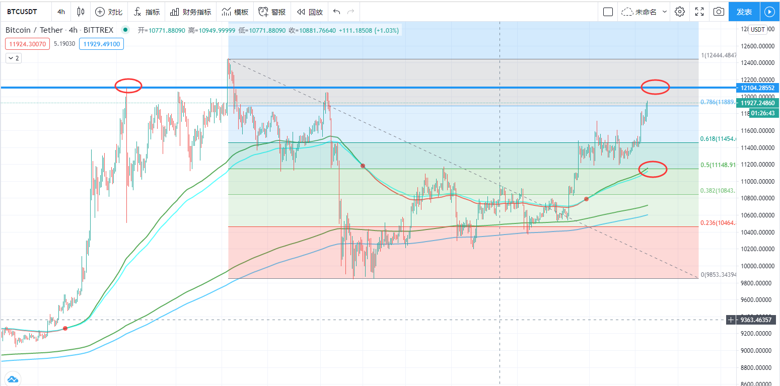 回顾历史行情,我们从盘面上可以很清楚的看出,行情上探高点处于12000一线附近,8月2日以来,最高位12100一线,而目前来看,行情突破斐波拉契回撤位置0.786后,不断试探上方市场心理压制位12000一线,而就盘面来看目前点位距离前期多次试探高位还有一百多点的距离,所以个人看来进场空单的朋友可以先等下,这波多单可以不追,但是做空单的话建议还是稳健为好。