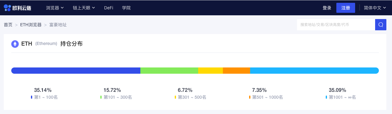 欧科云链OKlink数据显示,目前 ETH 持仓前 300 名,掌握了总计 50.86% 的 ETH,与上周维持一致;整个持仓分布呈现椭圆形结构,各个部分占比分别是:第 1~100 名,占比 35.14% ,环比上涨 0.04%;第 101 ~ 300 名,占比 15.72% ,环比下降 0.04%;第 301 ~ 500 名占比 6.72% ,环比上涨 0.05%;第 501 ~ 1000 名,占比 7.35%,环比上涨 0.04%;第 1001 名后,占比 35.09%,环比下降 0.09%。