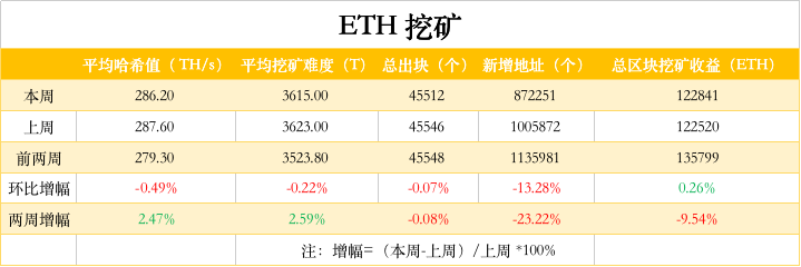 etherchain.org 数据显示,平均算力环比下降 0.5%,暂报 286 TH/s;平均挖矿难度达到 3615 T,环比下降 0.22%;矿总收入环比微涨 0.3%;新增地址环比下降 14%,链上活跃度大幅下降。