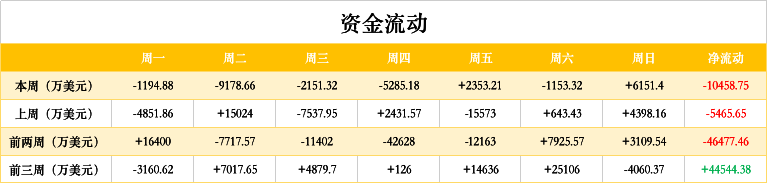 资金方面,上周最大净流入接近 6000 万美元(周日),最大净流出超过 9000 万美元(周四);ETH 上周全网资金净流出约 1.04 亿美元,环比上涨 91%;从资金流动趋势来看,流出趋势扩大;未来一周,价格层面以盘整震荡或小幅回调为主。