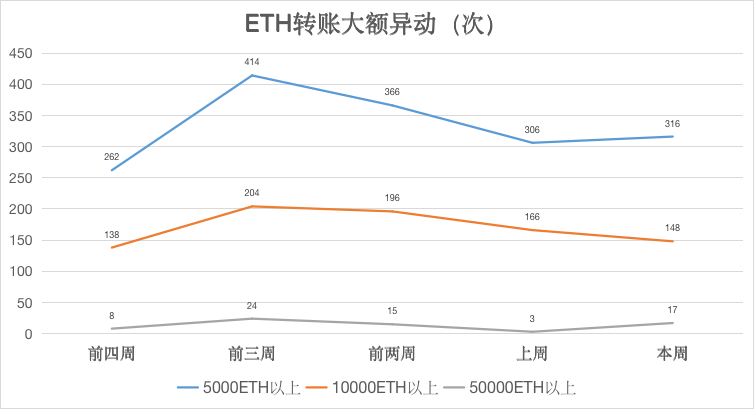 Tokenview数据显示,链上转账次数上周小幅下降,“5 千 ETH 以上”、“1 万 ETH 以上”大额转账次数环比下降 3.2%、10.84%,但“5 万 ETH 以上”大额转账次数环比上涨 466%,巨鲸账户异动频次明显增加,其中有多笔转账汇入 Eth2.0 存款合约。
