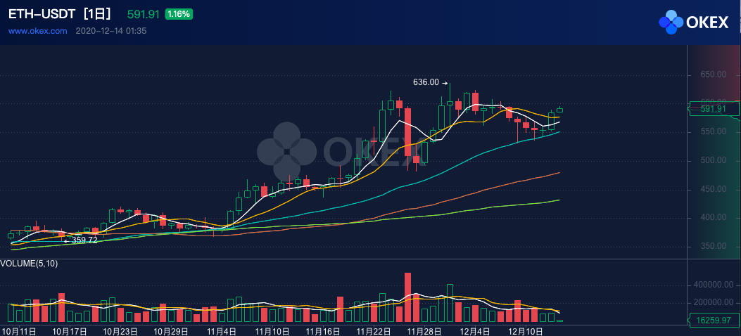 OKEx 行情数据显示,上周 ETH 价格酷烈波动,一度下跌至 535 USDT,而后反弹至 590 USDT,周内收于 585.15 美元,环比下跌 1.5%。