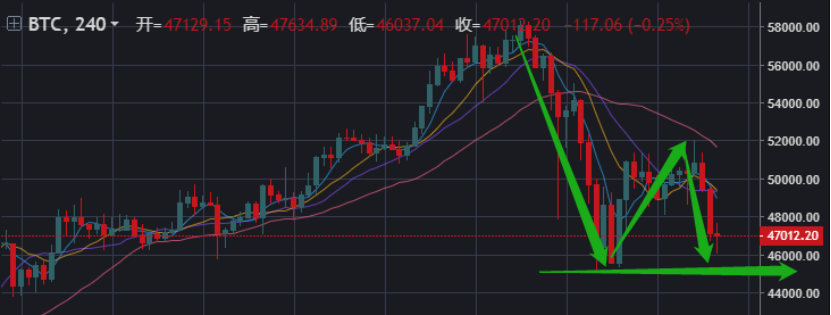 截止发稿,二次下探低点接近46000,但仍未跌破就收了上去,到达47000上方,这个低点是要比45000高的。如果日内不再继续下跌,那么接下来的行情就是多次下探,震荡,且低点一个比一个高。由此进行底部夯实,蓄势待发,为下一步的拉升奠定基础。