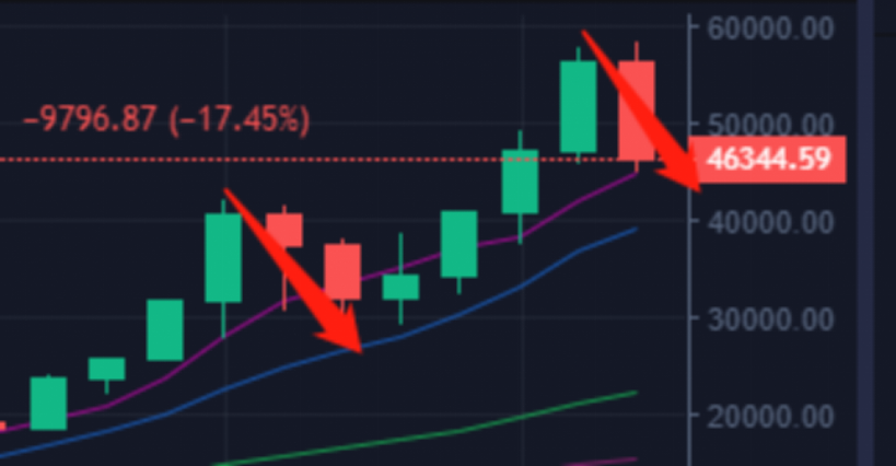 那么我们说,这次下跌是可预见的,因为当行情触及58000以后,第一次回调56000附近时,大家就应该察觉到万点暴跌即将来临。下图是比特币的周线行情图,我们看下上周的K线,一根大阳线直冲云霄,将BTC带入到新的空间,然而问题也出现了,在技术上,行情严重脱离均线位置,这就说明当前币价位置已经十分不合理了,调整势在必行,否则,这样的牛市是疯牛,是不理智的,不长久的。