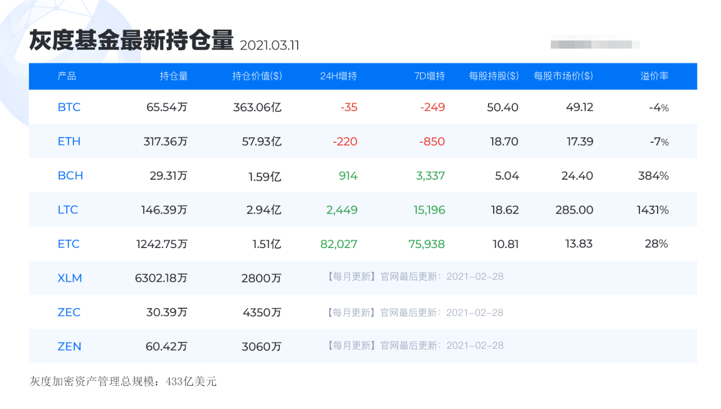 灰度LTC信托持仓增持2449LTC,最近7天累计增持15196LTC,溢价率1431%;
