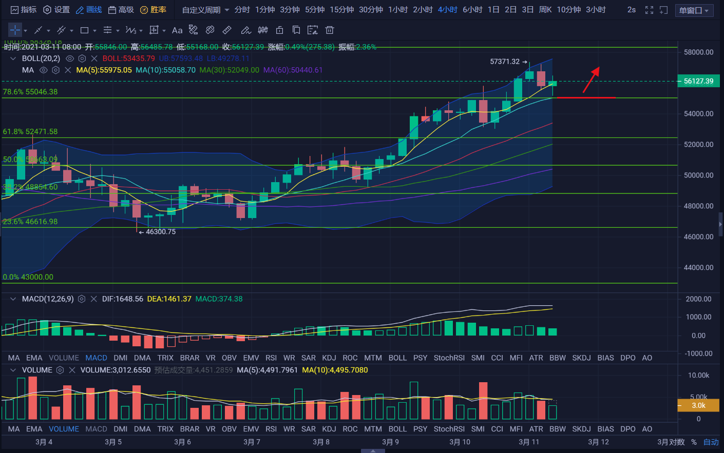 4小时级别上看,4连阳的强势多头格局已经打破,上根K线收阴,目前行情处于回调中,下方支撑在蓝色MA10均线处;易天认为,日内的多头实力强劲,价格虽有回踩,整体还是多头占优,建议顺趋势把握利润,但价格已逼近新高,不建议盲目追涨,稳健还是回踩多单为主,破位之后顺势跟进。上方关注目前高点57371一线阻力位,破位看58000,下方关注55600一线支撑,破位看55000支撑位!