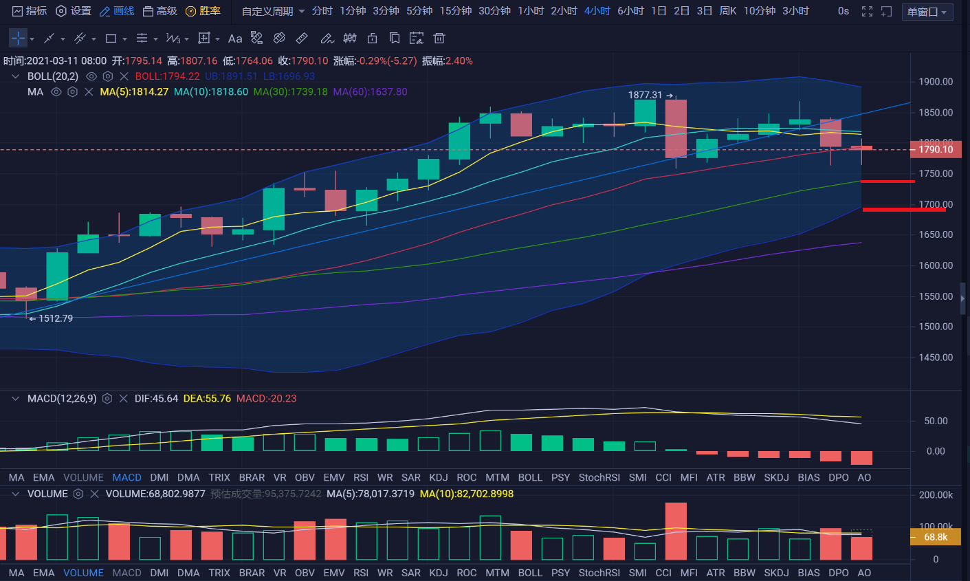 4小时图上看,BOLL通道有收口迹象,上根大阴直接刺穿中轨支撑,但是收线在BOLL中上轨区域;MA5和MA10均线粘合运行,对目前以太坊行情形成上方压制,目前已经跌破BOLL中轨支撑,进入中下轨区域;附图指标向下放量,价格有下行的意图,易天认为,日内的多头实力强劲,但价格的回踩也在彰显空头的实力,目前多空局势焦灼,价格大概率还是维持一个区间盘整的格局,但近日来的多头实力强劲,上行趋势并未改变,操作建议回调多单为主。上方关注1820,其次看日内高点1877,下方关注1740支撑,破位看1760附近;