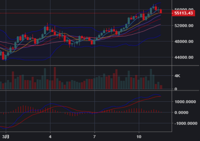 综合来看,行情高位受压,未来24h回调将是主旋律,但是向上的大方向暂时没有改变,接下来两天重点关注55000的坚守情况。