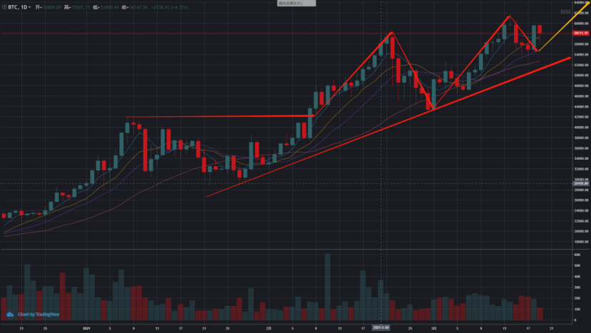 在2月22日,BTC由58300附近一路狂泄,直至最低的43000附近,整整跌去了15000多点,很多人以为牛市结束了,当时小编还出一篇文章,大致说本次下跌属于正常回调,BTC周线需要回归均线,一次“牛回头”而已,只需等待,不必惊慌。果不其然,接下来的行情也验证了小编的想法。在接下来一两周里,BTC在50000关口持续震荡,行情也于上周一开始不断震荡上涨,最后也是迈过了58300这个历史高位,到达了61800的位置。