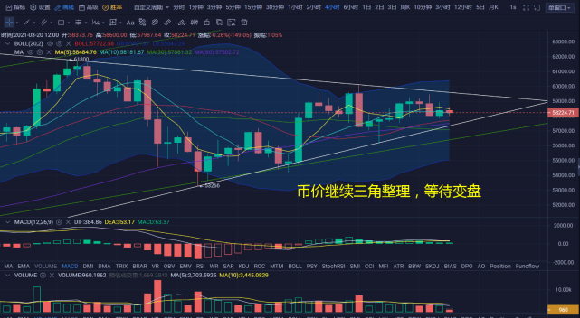 昨天我们文章为什么说币价要在57500-59500美元作区间震荡?是因为上方61000美元阻力还比较大,下方支撑也比较明显,因此币价会走出三角形末端整理的走势,而走出末端三角形末端整理的走势除了消化上方压力之外还会为接下来变盘做铺垫,因此今天我们要说的就是变盘是否越来越近了,市场该如何判断?
