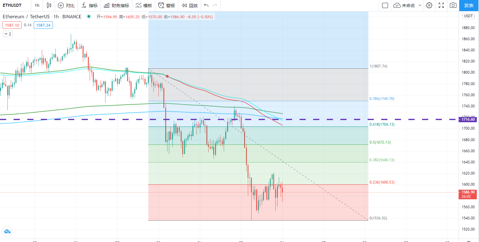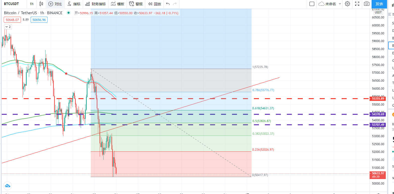 由于比特币目前价位还是处于今年年初以来的上升趋势通道下方,所以我们完全可以暂时放弃多头思路,在操作上以高空为主,毕竟前面说的很清楚,行情在上升通道内以多单为主,上升通道下方以空单为主,而就图上来看,没有别的想法,到位斐波拉契回撤0.5位置53800去进场空单就好,当然风控还是要做好的,极限压制位0.618位置即可,强势破位反手追多上看vegas隧道粘合点55500一线级即可。