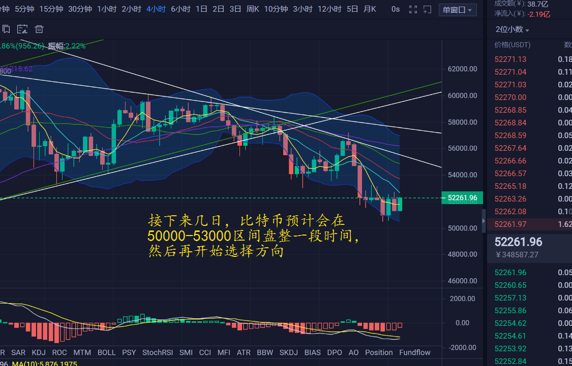 综合以上:在如此多的市场因素交织在一起的情况下,今天币价的走势仍然会比较纠结,大概率还是先在50000-53000美元震荡,震荡完之后会选择变盘,从周期上看就看今天白天的走势了,如果震荡过后不能往下破50000美元,晚上12点如果还没有选择向下砸盘,那短期就要先向上反弹一下下了