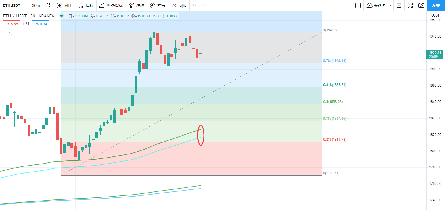 凌晨以太坊独领风骚,最高涨至1945一线,涨幅距离昨日回撤低点1770一线175个点,不得不说是近日最大涨幅,随后以早间震荡回落,目前震荡在1920-1930区间内,整体上没有太大的波动,但是就目前行情来看,行情有回调积蓄势能以供震荡向上,所以今日操作思路上个人建议不要追高,等待回调再去进场不迟,回撤利润可吃可不吃,宁可错过不可做错,短线上1935-1940一线可作为轻仓空单布局点位,下方斐波拉契回撤线0.786位置1908短线轻仓多单支撑(力度较弱可进可不进,进场做好风控),极限支撑斐波拉契回撤线黄金分割位0.618位置1878一线,破位反手空单下看vegas隧道1826-1810一线,操作上以博取回撤利润为主。