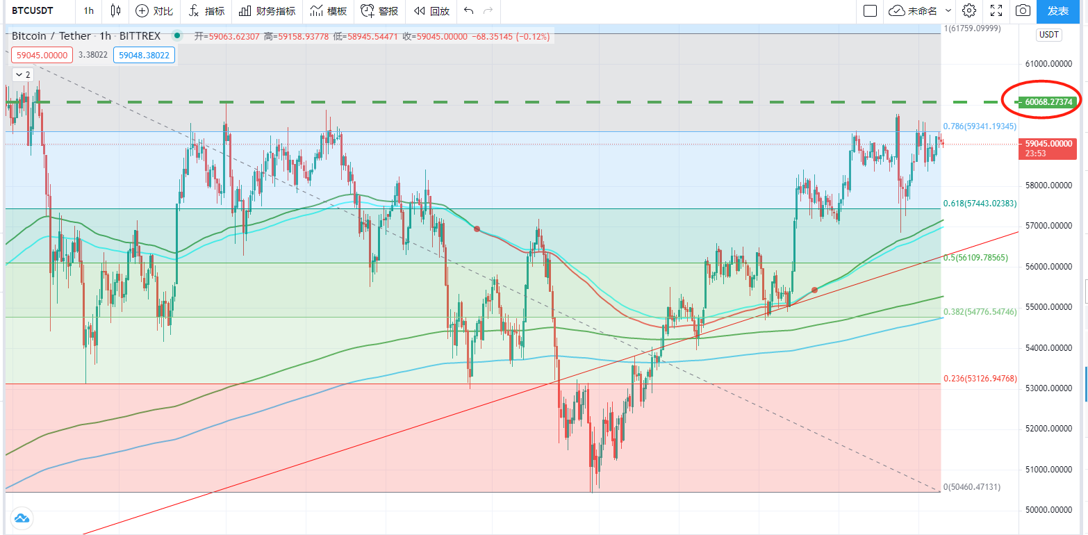 目标上看前期历史高点61300-61000一线,行情在没有突破60500一线前,空单还能轻仓介入,但是震荡破位,建议大家还是放弃空头思路为好