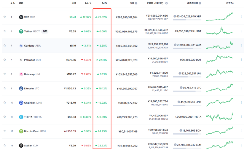 在下图我们可以看到近一周,市值排名比较靠前(剔除BTC,ETH)的币种的涨跌幅统计(红色框中)。