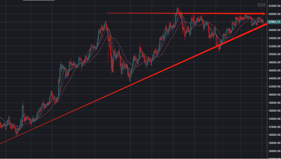 综合分析来看,经过最近几天的横盘震荡,行情即将步入收敛三角区间的末端,新的行情似乎正在酝酿,加之各大现货交易所中所呈现的成交量能正在不断衰减和萎缩,未来短时间内,BTC将面临风向选择,目前通过各方面数据来看,向上概率则十分大。在未变盘前,接下来的行情大概率仍以震荡为主,上方看4h级别MA30均线即58400的压力,下方则看日线级别MA30均线即57200的支撑。