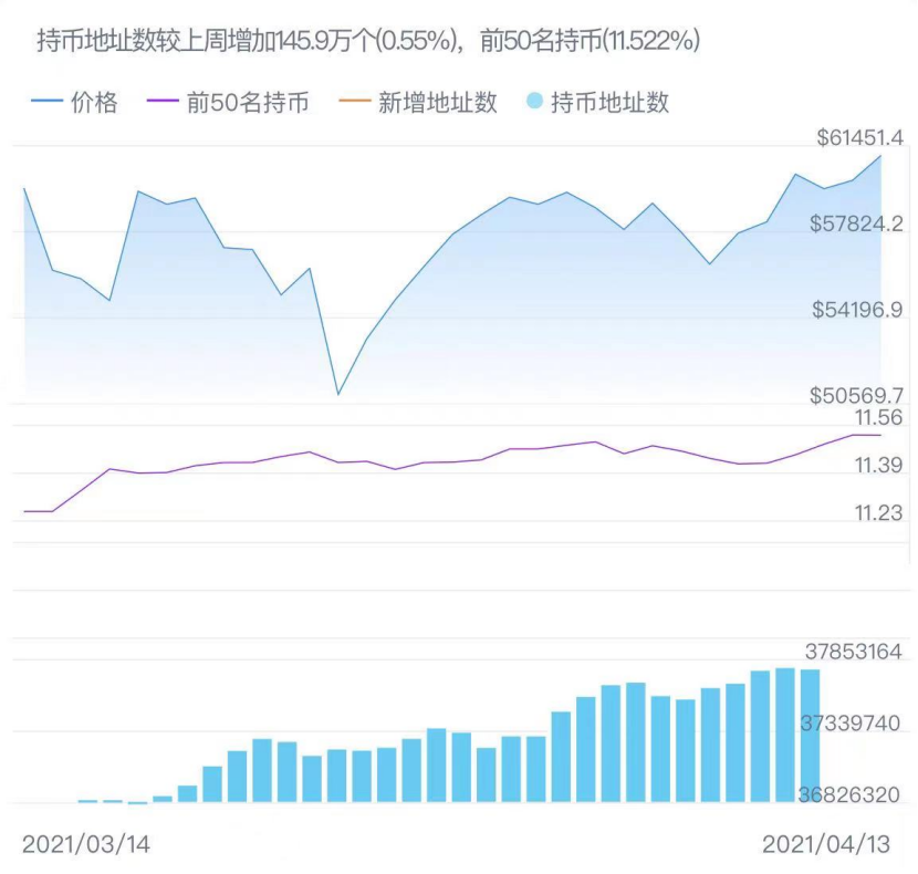 上图是整个比特币链上情况,图中紫线为前50持币地址占比变化情况,下方蓝色柱形图为BTC总持币地址变化量。“富豪榜”成员们仍在不停的加码增持,前50持币地址持币占比在近一个月持续攀升,包括新增地址数量也在不断增加,这都能反映出大户,以及散户都一致认可BTC的价值,看好BTC的未来。