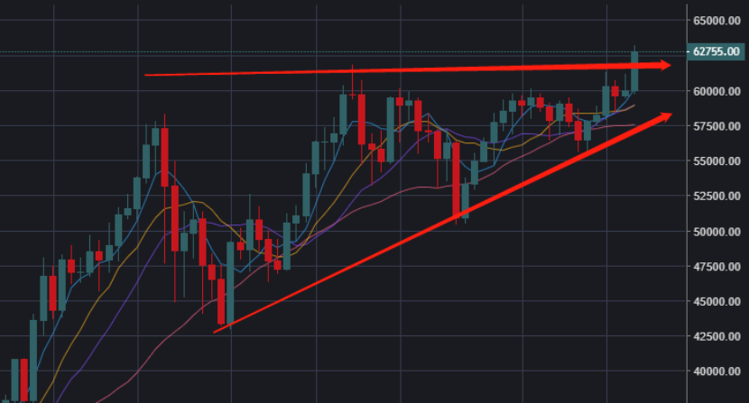 据Bitcoinwin数字货币平台行情显示,比特币在昨日午后放量上攻突破62000一线压力位,直冲至目前最高的64500,目前行情运行在62700附近。