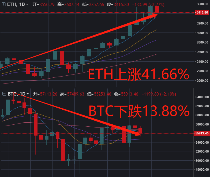 让我们来对比下两者的行情,BTC从64800附近高位一路下跌至目前的55800附近,下跌幅度为-13.88%,而以太则从2400附近一路上涨到了3400附近,上涨幅度为41.66%,且今日触及3600的历史高位。今年以来,以太坊涨幅已达到360%。