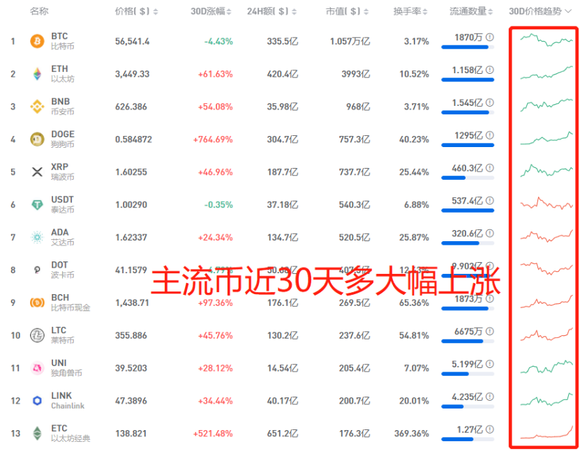 我们从上图可以看出主流币自四月以来,均大幅上涨,狗狗币更是恐怖的上涨10倍多,令人无不惊呼,叹为观止。