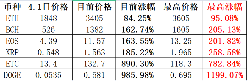 我们简单统计下几个主流币从4月1日以来的涨幅变化。