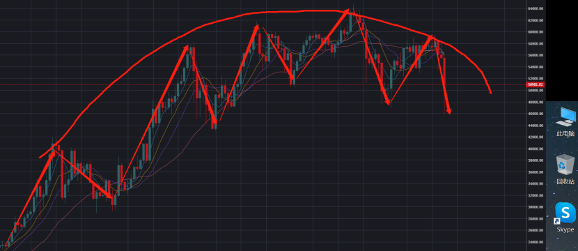 其三,技术层面,BTC再次进入压力区58000-60000,抛压较大,回调需求加大,包括短时4小时级别上,量价背离同样严重。波浪形态上似乎已进入后浪阶段,包括日线走势上,也已经走出圆弧顶形态,上攻力度明显降低,下跌趋势凸显,这些都似乎预示后市行情的走低,这是一种很糟糕的情况。