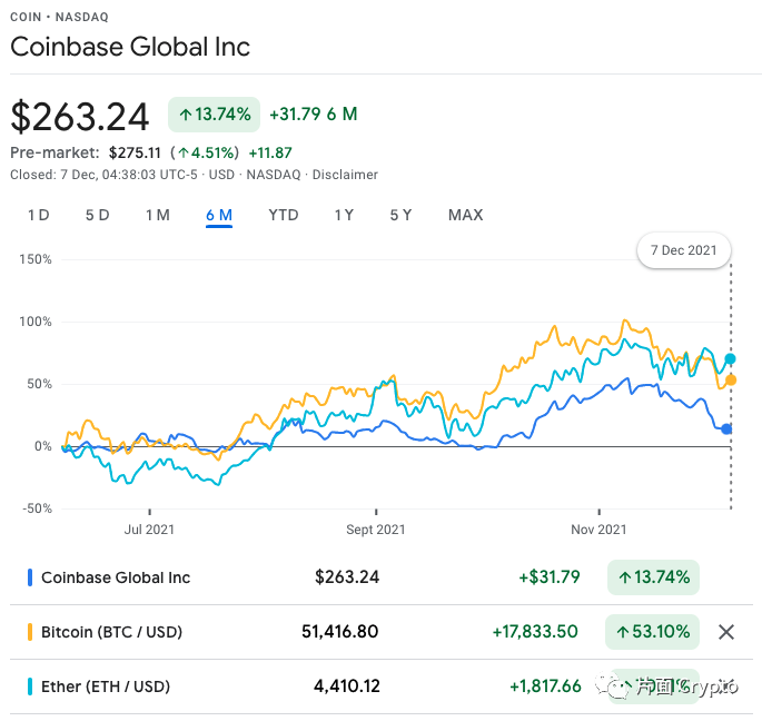 再直观一点的体现,Coinbase 的股票价格和比特币的价格就极为相关。