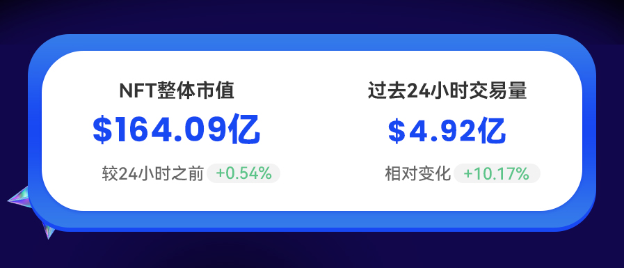 截至 2 月 10 日 15 时,NFT 整体市值 164.09 亿美元,较 24 小时前增长 0.54%;过去 24 小时内总交易量约 4.92 亿美元,日环比增长 10.17%。