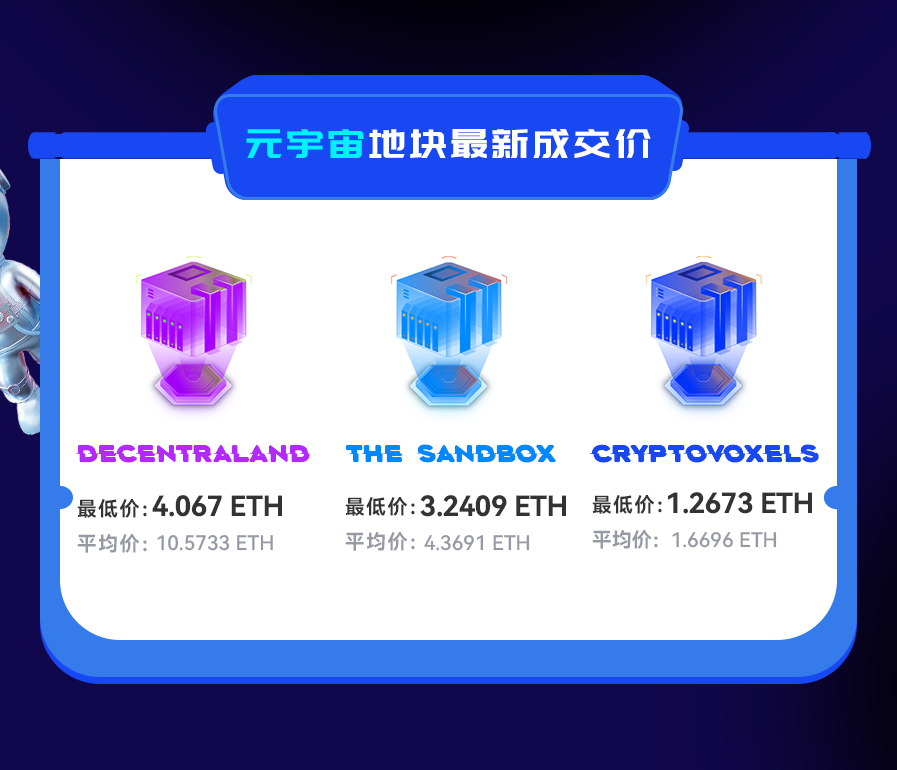 元宇宙平台中,过去 24 小时内,Decentraland 上的地块最低成交价为 4.067 ETH、平均成交价为 10.5733 ETH;The Sandbox 上的地块最低成交价为 3.2409 ETH、平均成交价为 4.3691 ETH;Cryptovoxels 上的地块最低成交价为 1.2673 ETH、平均成交价为 1.6696 ETH。