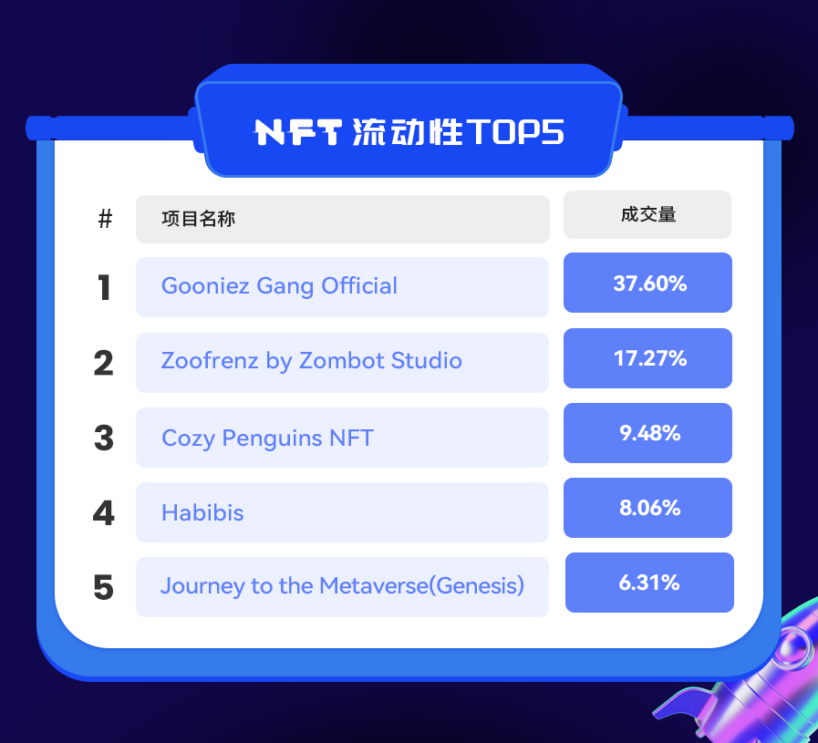 按过去 24 小时流动性指标(注:流动性=交易量 / NFT 总供应量),排名前五的项目分别为 Gooniez Gang Official(37.60%)、Zoofrenz by Zombot Studio(17.27%)、Cozy Penguins NFT(9.48%)、Habibis(8.06%)和 Journey to the Metaverse(Genesis)(6.31%)。