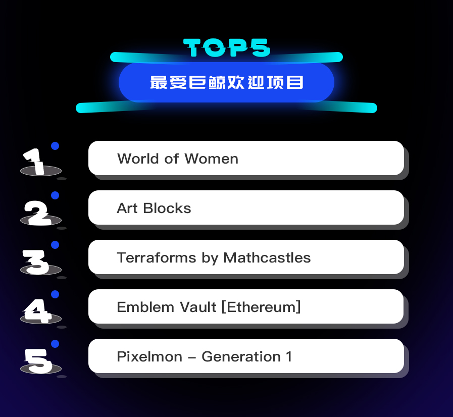 最受巨鲸欢迎项目排前五的分别是:World of Women、Art Blocks、Terraforms by Mathcastles、Emblem Vault [Ethereum] 和 Pixelmon - Generation 1。