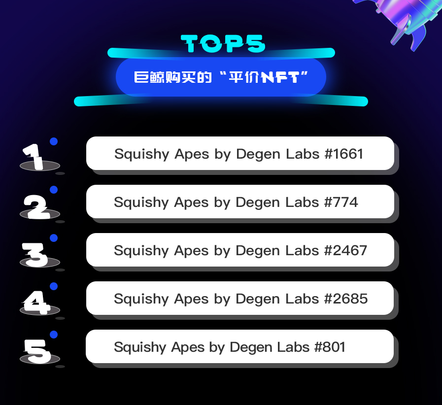 过去 24 小时,巨鲸购买的“平价 NFT”中排前五的分别是:Squishy Apes by Degen Labs #1661、Squishy Apes by Degen Labs#774、Squishy Apes by Degen Labs#2467、Squishy Apes by Degen Labs#2685 和 Squishy Apes by Degen Labs#801。