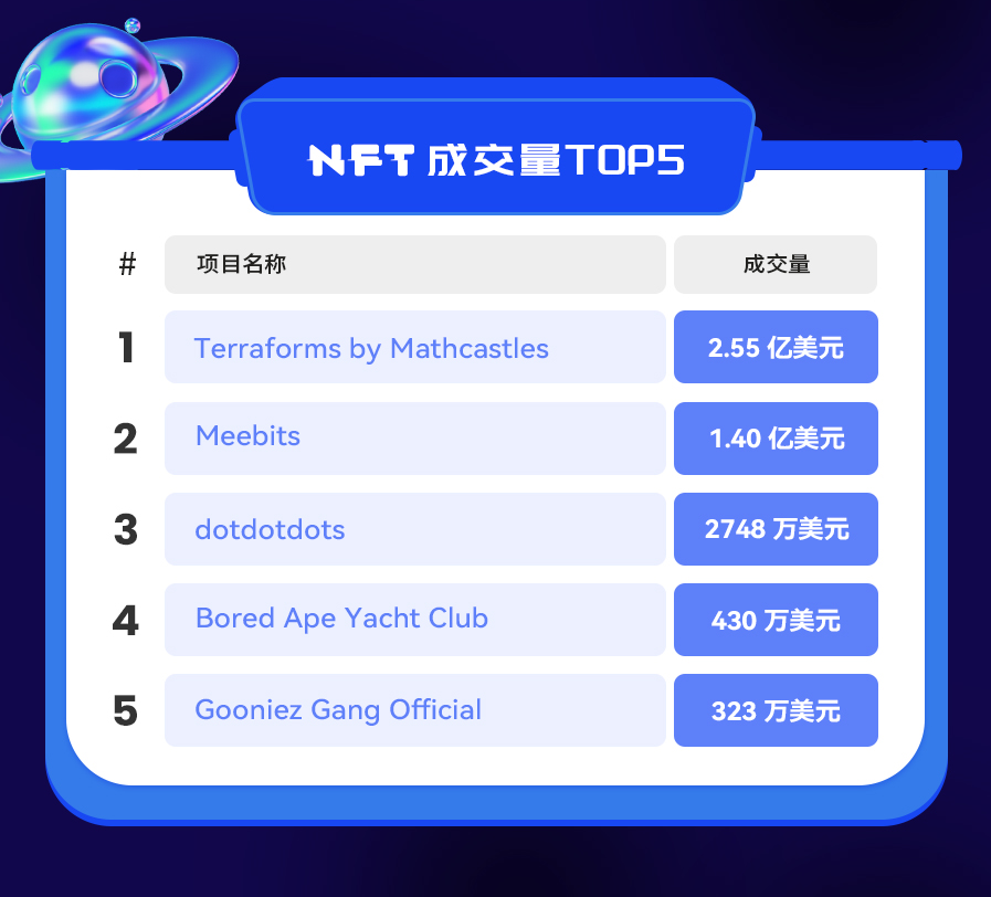 按过去 24 小时成交量,排名前五的项目分别为 Terraforms by Mathcastles(2.55 亿美元)、Meebits(1.40 亿美元)、dotdotdots(2748 万美元)、Bored Ape Yacht Club(430 万美元)和 Gooniez Gang Official(323 万美元)。