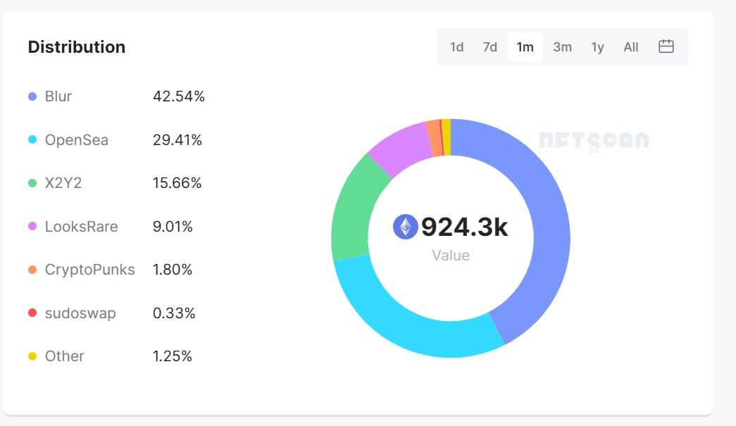 在 Blur 的交易空投活动加持下,过去一个月 Blur 的 NFT 交易量超越 OpenSea,约占整个 NFT 市场份额的 42.54 (如下图),一跃成为当前链上交易量最大的 NFT 聚合交易市场。