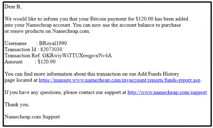 黑客组织使用被盗的比特币来支付 Namecheap 服务(图源 Mandiant)