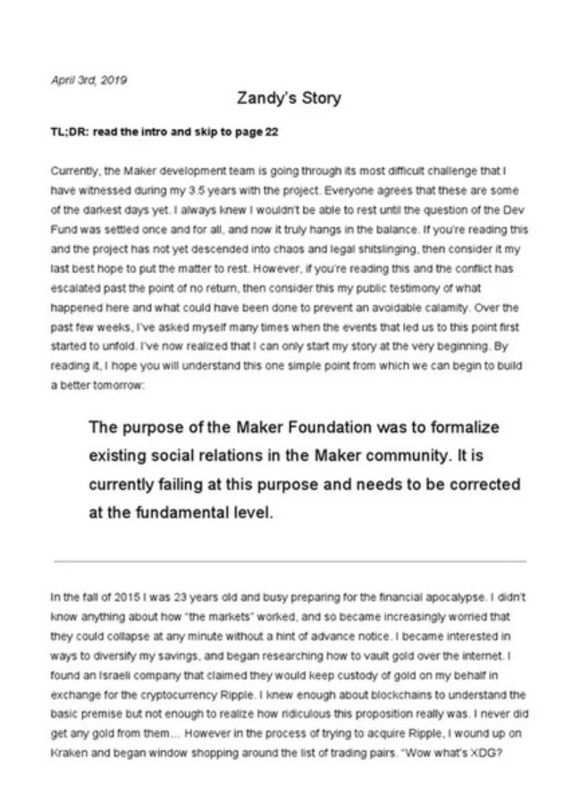 Rune 的观点发生了转变-他认为纯去中心化主义的道路限制了 DAI 的潜力,Maker 需要将自身整合到传统金融体系中,才能真正展翅高飞。Maker 在这一转变中失去了其首席技术官 Zandy。Zandy 在 2019 年 4 月 3 日留下了一篇名为《Zandy 的故事》的公开回忆录。