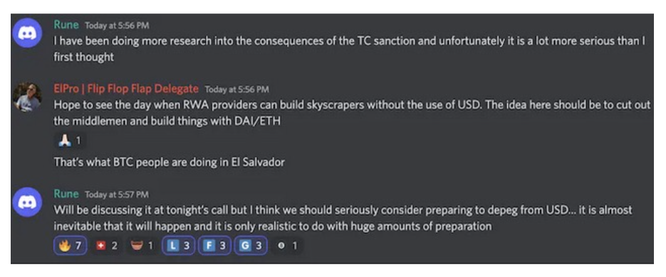 2022 年 8 月,亚历克谢·佩尔采夫(Tornado Cash 的创建者)被逮捕后,Rune(看似)意识到了 DeFi 所面临的严峻情况,甚至表示我们应该认真考虑将一个价值数十亿美元的稳定币(DAI)与美元脱钩。